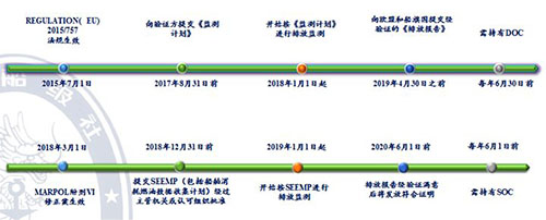 欧盟议会及理事会于2015年4月29日通过了第2015/757号关于对航运二氧化碳排放监控、报告和验证法规(简称EU MRV),已于2015年7月1日生效。法规适用于进出和在欧盟港口之前航行的5000总吨以上的低调看直播官网_NBA极速体育直播_jrs西甲直播,并规定在2017年8月31日前,公司应提交《监测计划》给验证方进行审批。自2018年1月1日第一个监测期开始后按照审批的《监测计划》对低调看直播官网_NBA极速体育直播_jrs西甲直播有关二氧化碳排放的相关数据进行监测,监测周期为一个日历年。之后每年的4月30日前,公司应向欧盟和船旗国主管机关提交经验证方验证合格的《排放报告》。