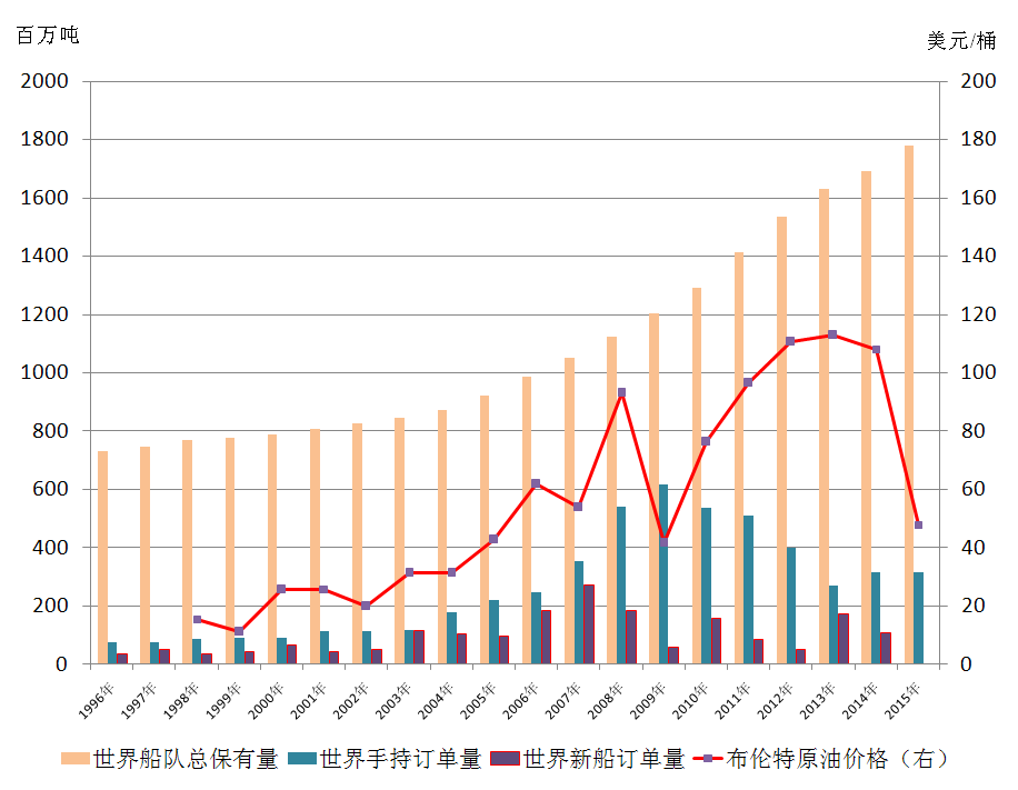 注:数据来源于克拉克松和凤凰网,手持订单量和船队保有量均为每年1月1日数据,新船订单量为每年订单总计,原油价格为每年1月份的月均值。