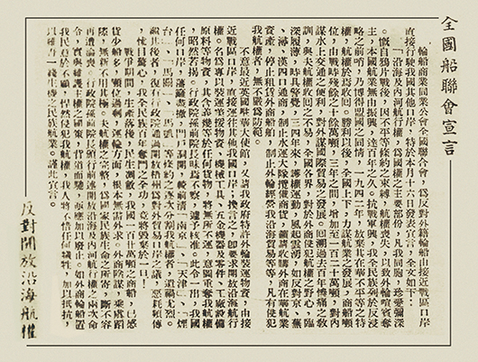 沿海海关还为洋人把持。1948年英国通过其驻华使馆竟公然要求旧政府正式放弃航权,遭到社会和航运行业的强烈抗争。全国船联会为此发表宣言,“不惜任何牺牲,加以抵抗”。全文如下: