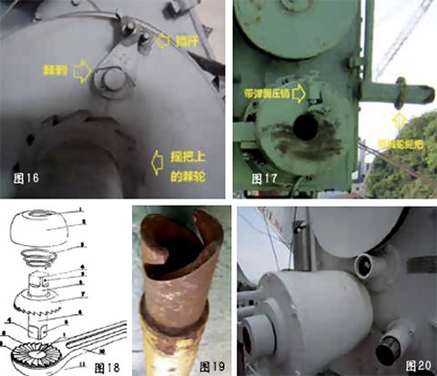 方形截面转轴如果反转(回收救生艇时转轴为正转,救生艇下降时转轴为反转),摇把是根本脱不开的,那么防止摇把反转可以分两种情况,阻止转轴反转和摇把不会跟着反转。如果转轴伸出长度足够,可以在上面加装一个棘轮,刹车罩上对应安装一个棘齿,但正常放艇都须先解锁棘轮或者关注棘轮的状态,这反倒增加了船员利用救生艇逃生的程序和风险,所以这种方式对于单转轴系统不可取。那我们换一种做法,在摇把上安装棘轮,刹车罩上对应安装一个棘齿,棘齿系统只会在摇把插入转轴且转轴反转时发挥作用,可行。但其具体型式及位置很重要,图16刹车罩上的棘齿可以保持在开启位置,有隐患。可以通过将挡杆的位置左移来排除此隐患,不过此挡杆很弱很容易锈掉,建议增强。