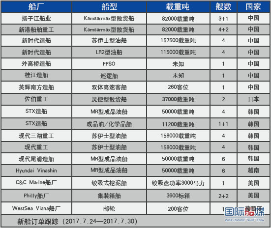 新船订单跟踪(2017.7.24—7.30)