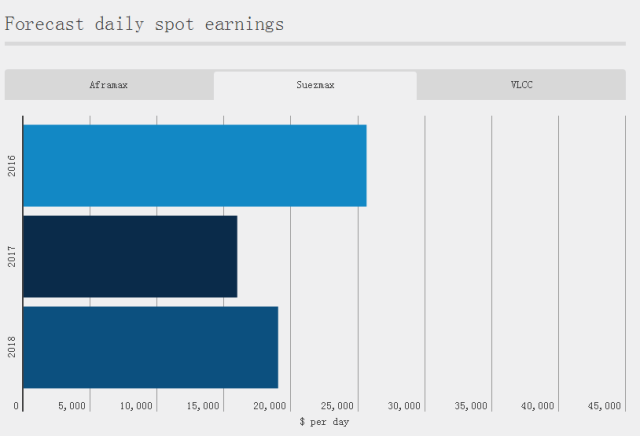 NBA极速体育直播 许多市场参与者预计,原油油轮运费率将在2017年年内触底。事实上,根据对平均收益预期的年度调查,所有原油油船船型的现货收益都将在2018年出现回升。超大型油船(VLCC)的每日收益预计将从24048美元升至26240美元,苏伊士型油船的收益将从15968美元升至19012美元,而阿芙拉型油船则从13182美元升至15648美元。