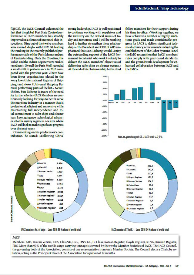 8月下旬,国际海事期刊《HANSA》对新任国际船级社协会主席、中国船级社总裁孙立成先生进行了专访。孙立成总裁阐述了在其担任主席期间,国际船级社协会的工作目标和主要任务。现将专访报道原文转载如下: